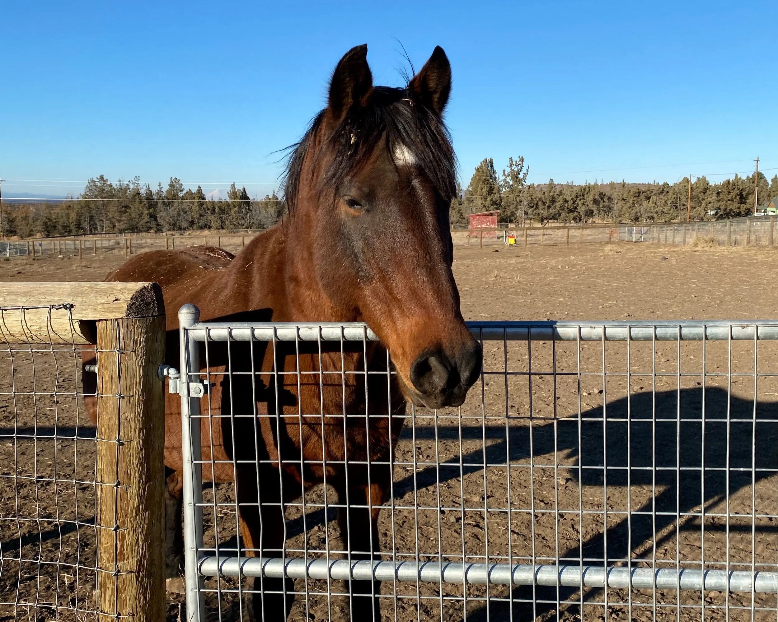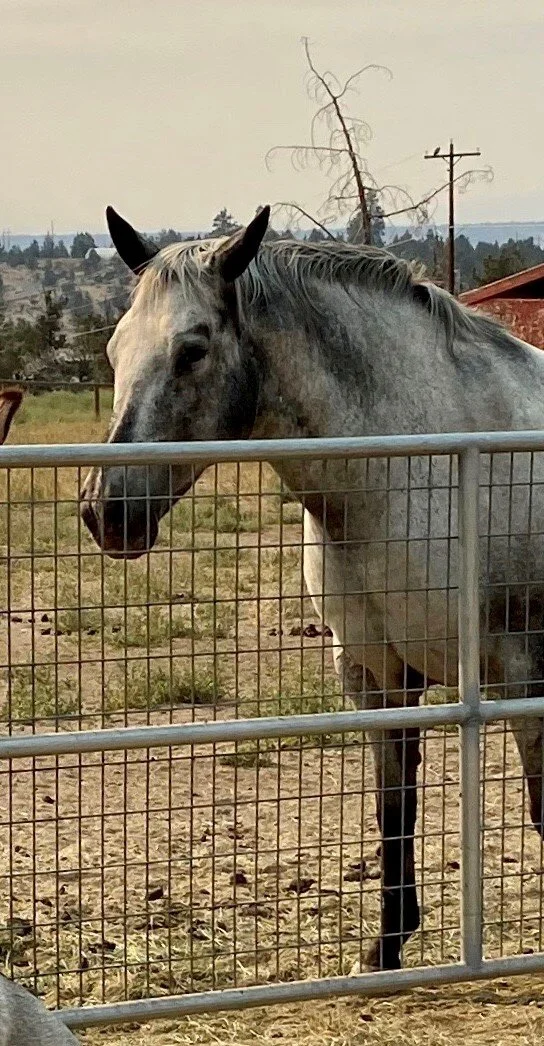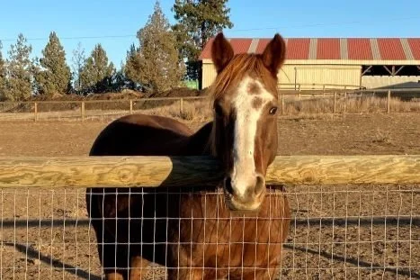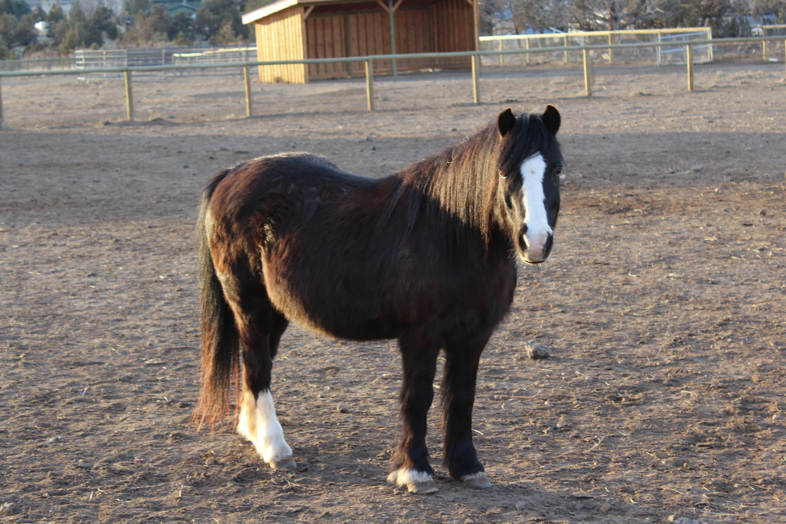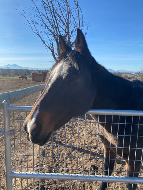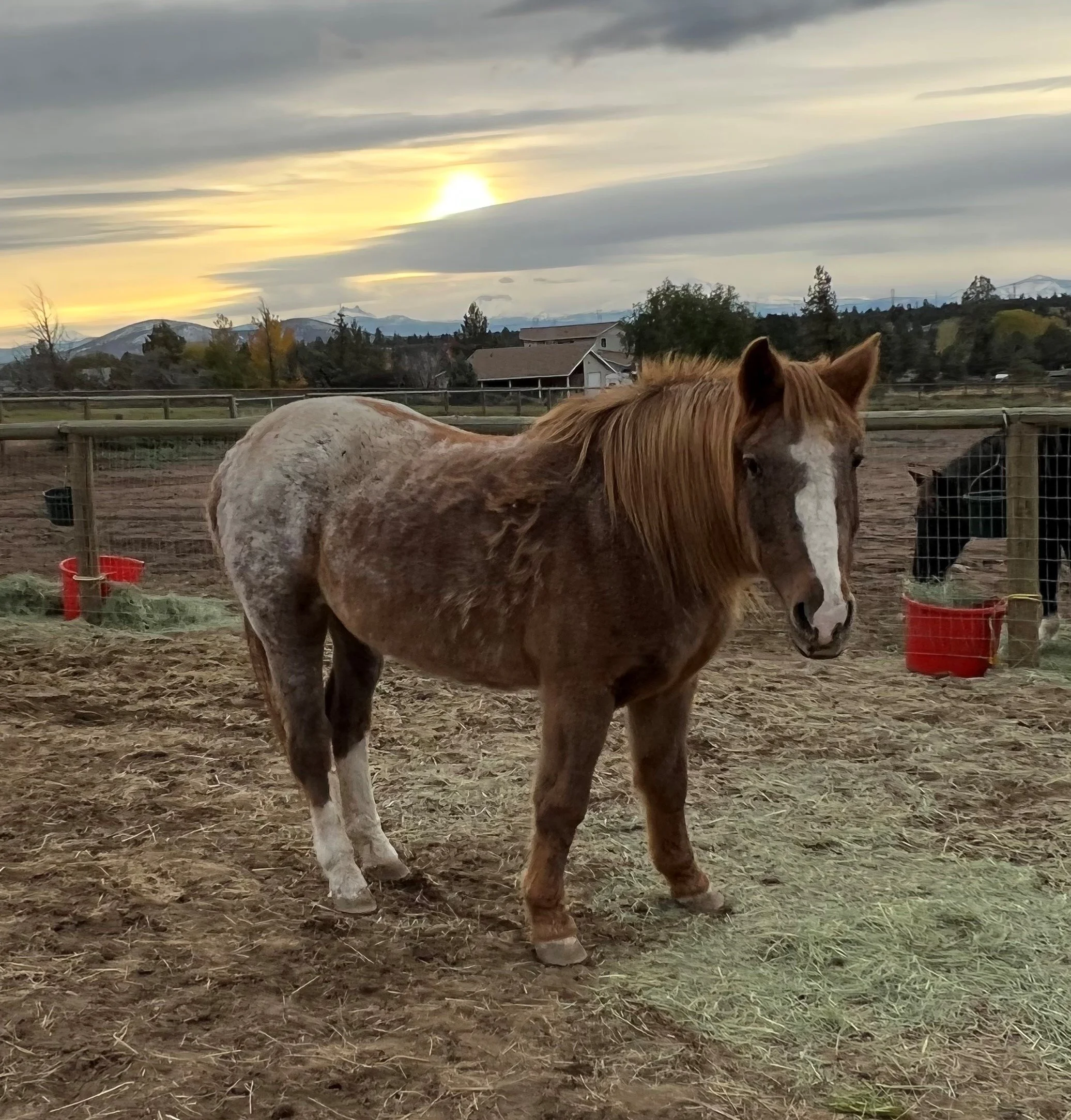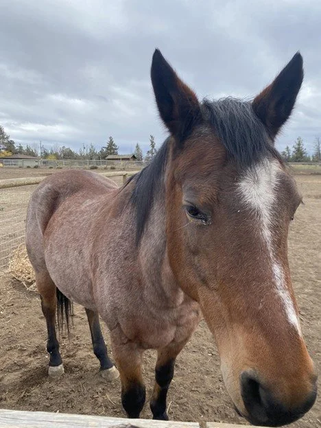 Galena was a dark brown quarter horse in her late 20’s who used to be active in the rodeo world as a riding horse. After her retirement, she went to live with Maggie. As their owner’s situation changed, they moved from Wyoming to Bend. Galena loved her food but didn’t mind sharing with the other old mares in the paddock. No one is ever left out at feeding time. Galena also liked to visit with the other horses nearby.