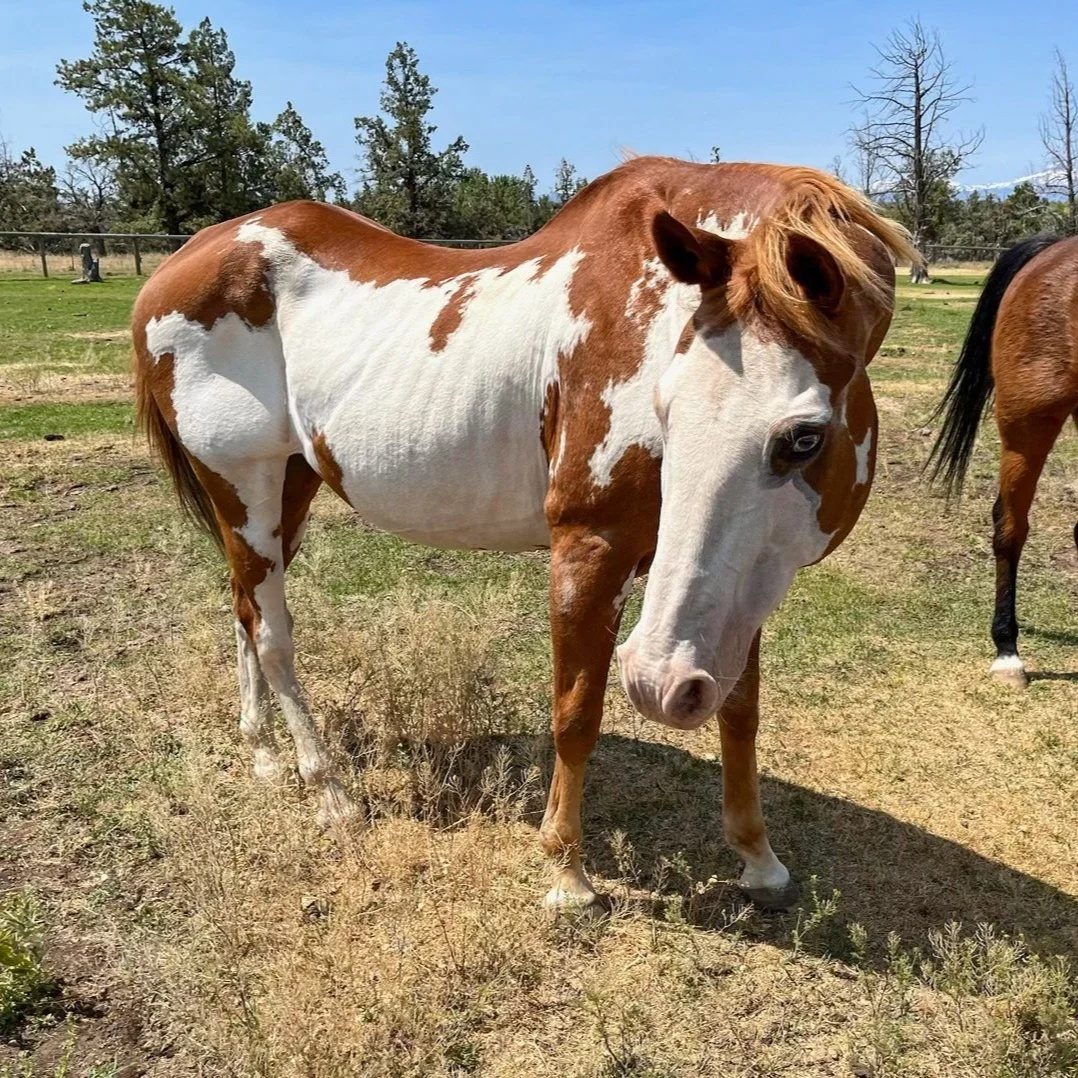 At 26 years old, Trooper is a well-trained, strikingly beautiful Paint horse with captivating blue eyes. From the moment he and his pasture mate, Tiki Rose, arrived at HeartSpace, they fit right in—finding peace, friendship, and a forever home.